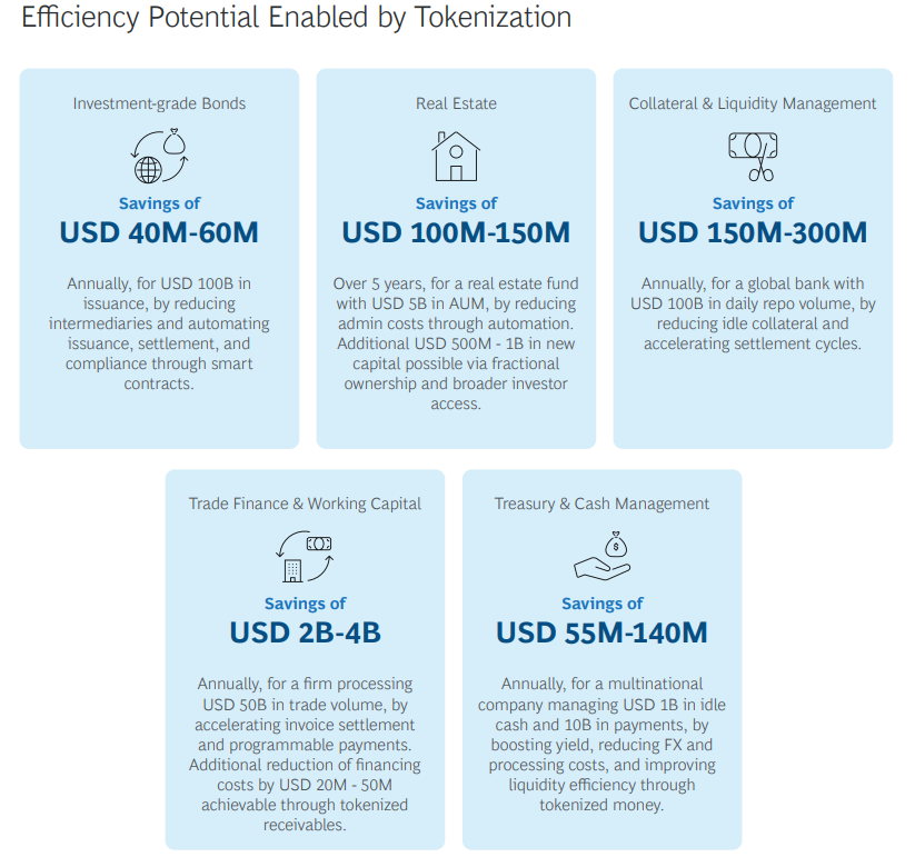De belofte van lagere kosten is niet wishful thinking – het verschijnt in de cijfers. Alleen al in het onderpandbeheer kan één wereldwijde bank per dag $ 100 miljard in repo-transacties verplaatsen, $ 150-300 miljoen per jaar pakken door alleen realtime tokenisatie aan te nemen en de naslaan onderpand te elimineren. Een fonds van $ 5 miljard voor onroerend goed zou tot $ 1 miljard aan kapitaal kunnen vrijgeven en de administratieve kosten met $ 150 miljoen kunnen verlagen over vijf jaar.