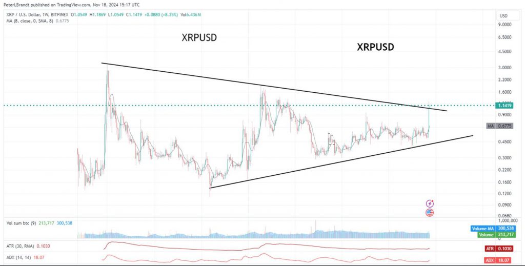 De prijsstijging van XRP is een hoogtepunt op de markt, aangezien deze de $1 overtreft en in november 2024 $1,265 bereikt. De XRP-vooruitzichten voor 2024 laten een drastische verschuiving zien. Peter Brandt Ontdekt een “enorme spoel” Ripple staat klaar om hoger te bewegen als resultaat van dit patroon. De recente stijging van de muntprijs van Ripple benadrukt de technologische structuur van Ripple. De markt krijgt steeds meer grip.