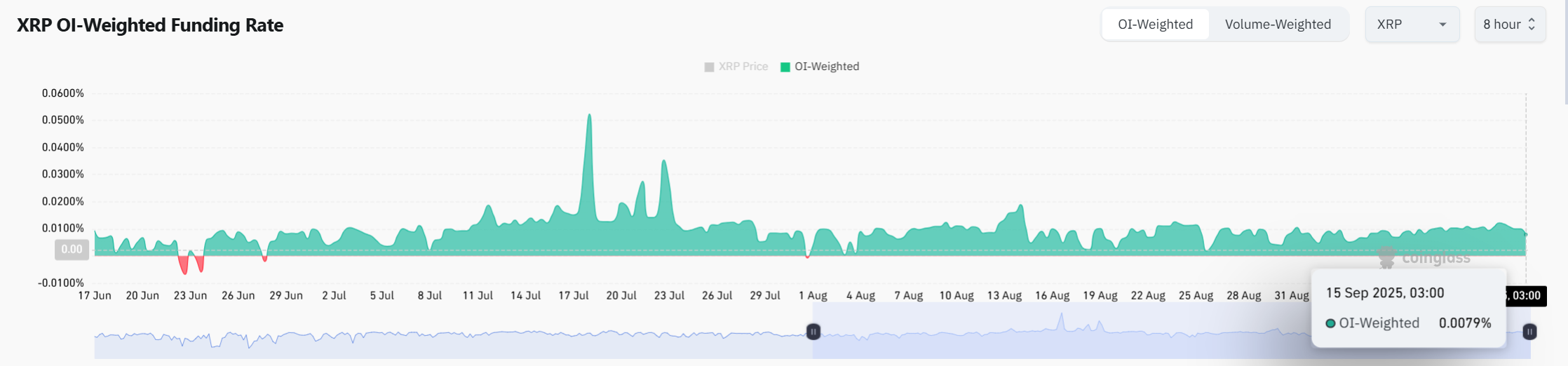 Gegevens van derivaten toonden aan dat de OI – gewogen financieringspercentages van XRP 0,0079% waren vanaf het moment van de pers. De gegevens weerspiegelen een saldo bij hefboomhandelaren.